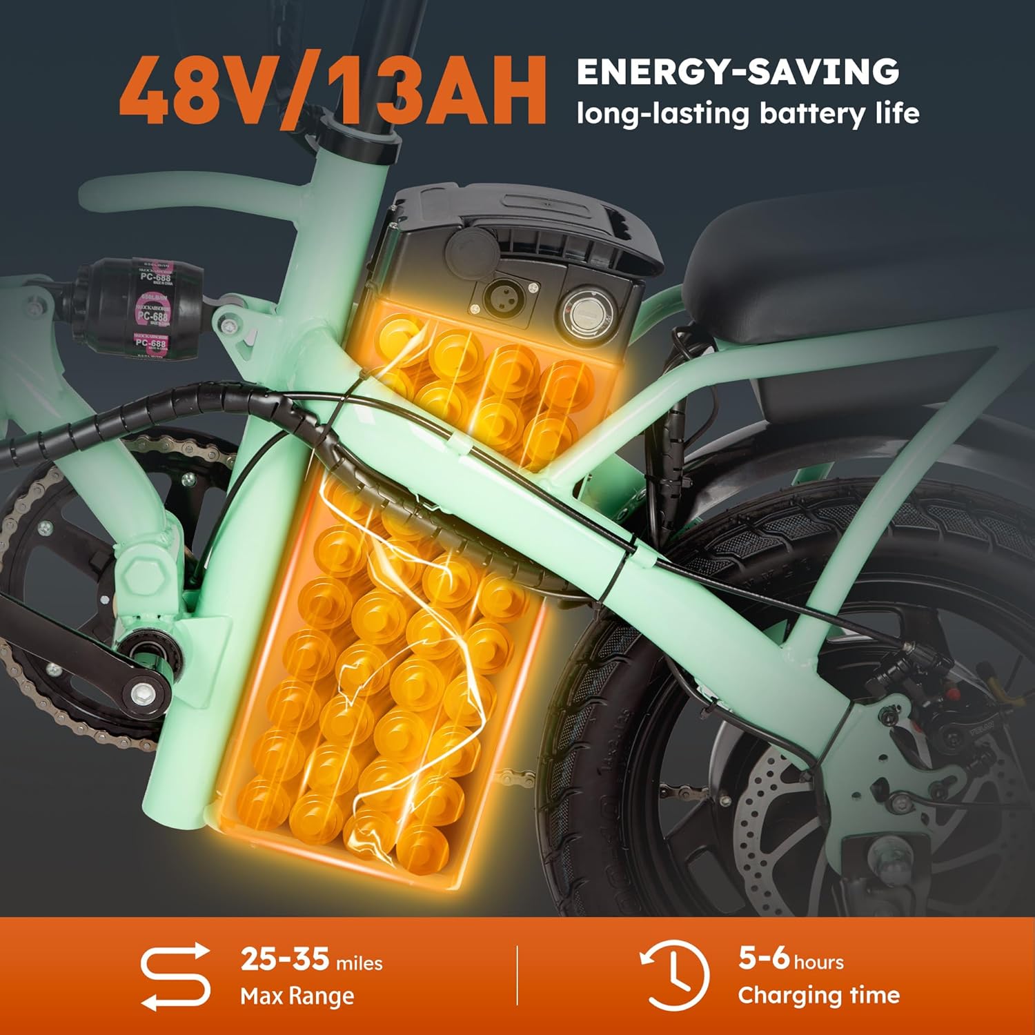 【Removable 48V 13Ah Lithium Battery】: This Electric Bike comes with a 48V 13Ah lithium battery that charges in just 5-6 hours. With a single charge, you can travel up to 25 miles (40.23 km) in full-electric mode or up to 35 miles (56.33 km) in pedal-assist mode(PAS 1), Provides greater driving range and flexibility for your daily rides. The removable battery design makes it easy to charge and store.