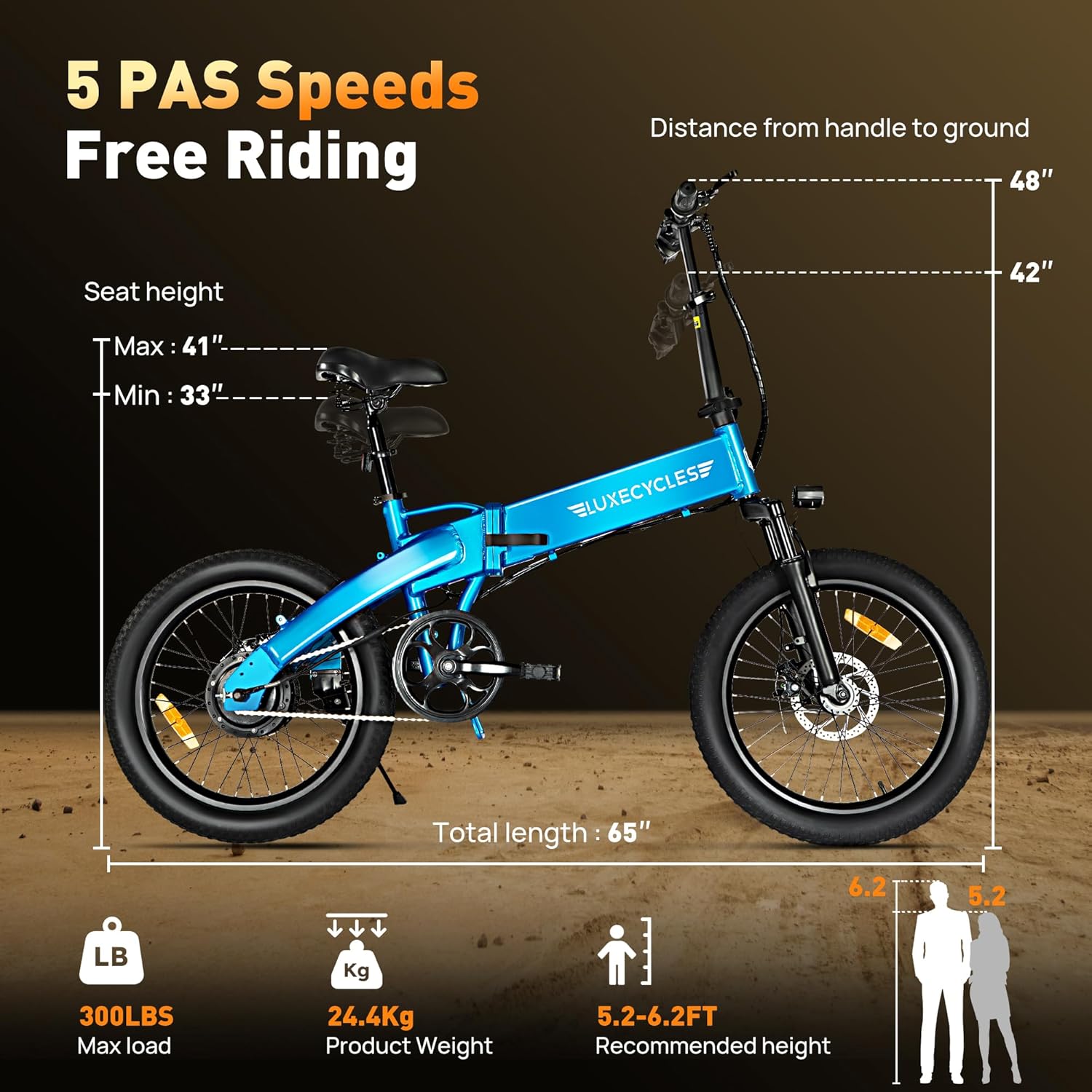 【Easy to Carry】: Wheel size: 14 inches, packing size: 51.96 * 8.26 * 25.39inches, packing weight: 66.13LBS. Electric bicycles can be folded, with a size of 31.49 * 20.47 * 23.22inches after folding, occupying a small space and making it very convenient to carry and ride outdoors in the trunk.Plus, the seat and handlebars are fully adjustable, so riders of all heights can set it to their ideal comfort level for any adventure!