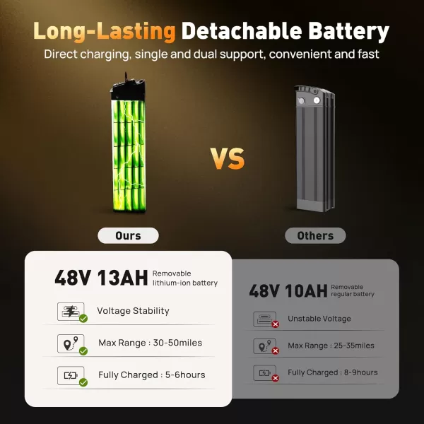 【Removable 48V 13Ah Lithium Battery】: This Electric Bike comes with a 48V 13Ah lithium battery that charges in just 5-6 hours. With a single charge, you can travel up to 25 miles (40.23 km) in full-electric mode or up to 35 miles (56.33 km) in pedal-assist mode(PAS 1), Provides greater driving range and flexibility for your daily rides. The removable battery design makes it easy to charge and store.